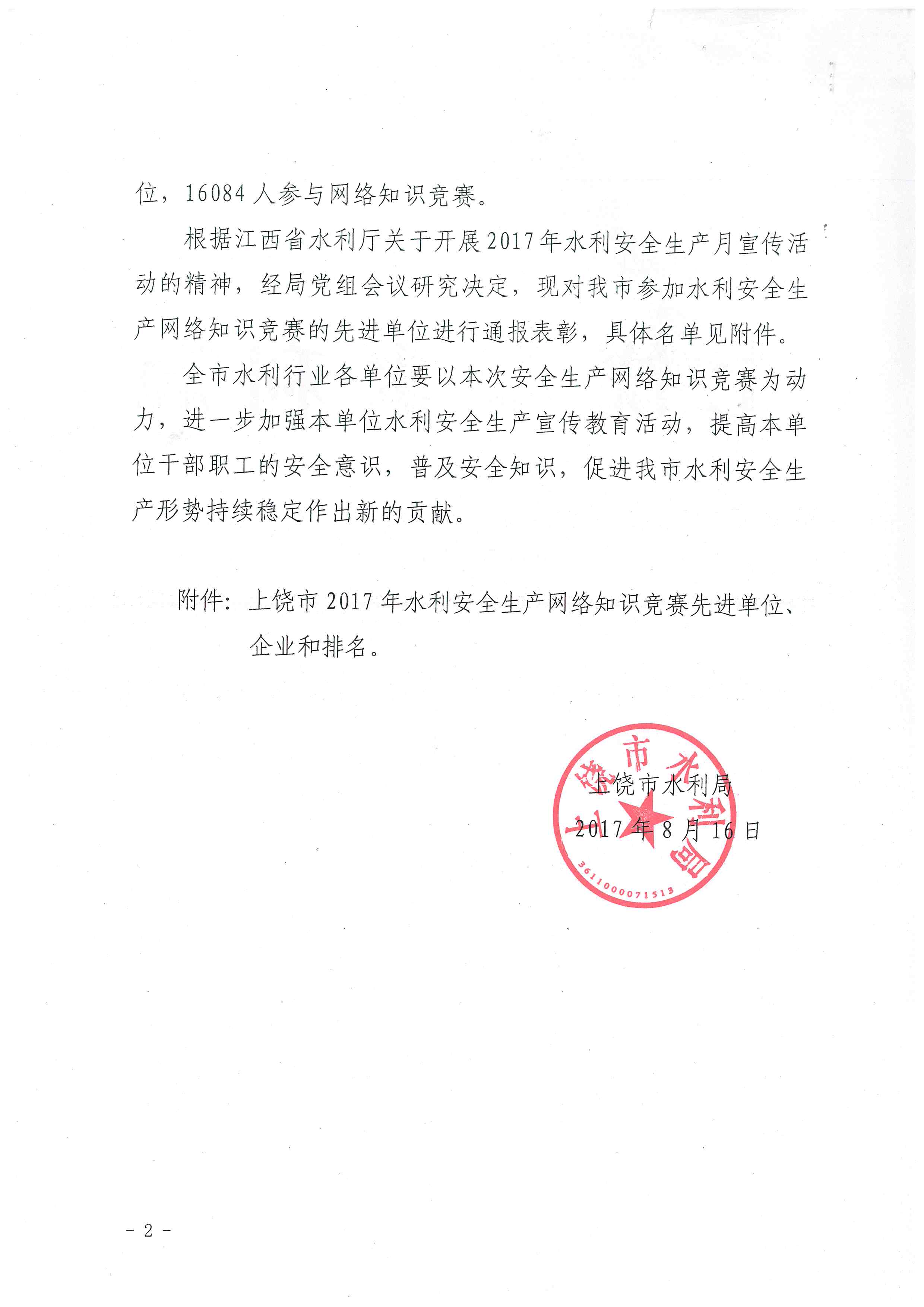上饒市水利局關(guān)于全市2017年全國(guó)水利安全生產(chǎn)網(wǎng)絡(luò)知識(shí)競(jìng)賽參賽情況的通報(bào)