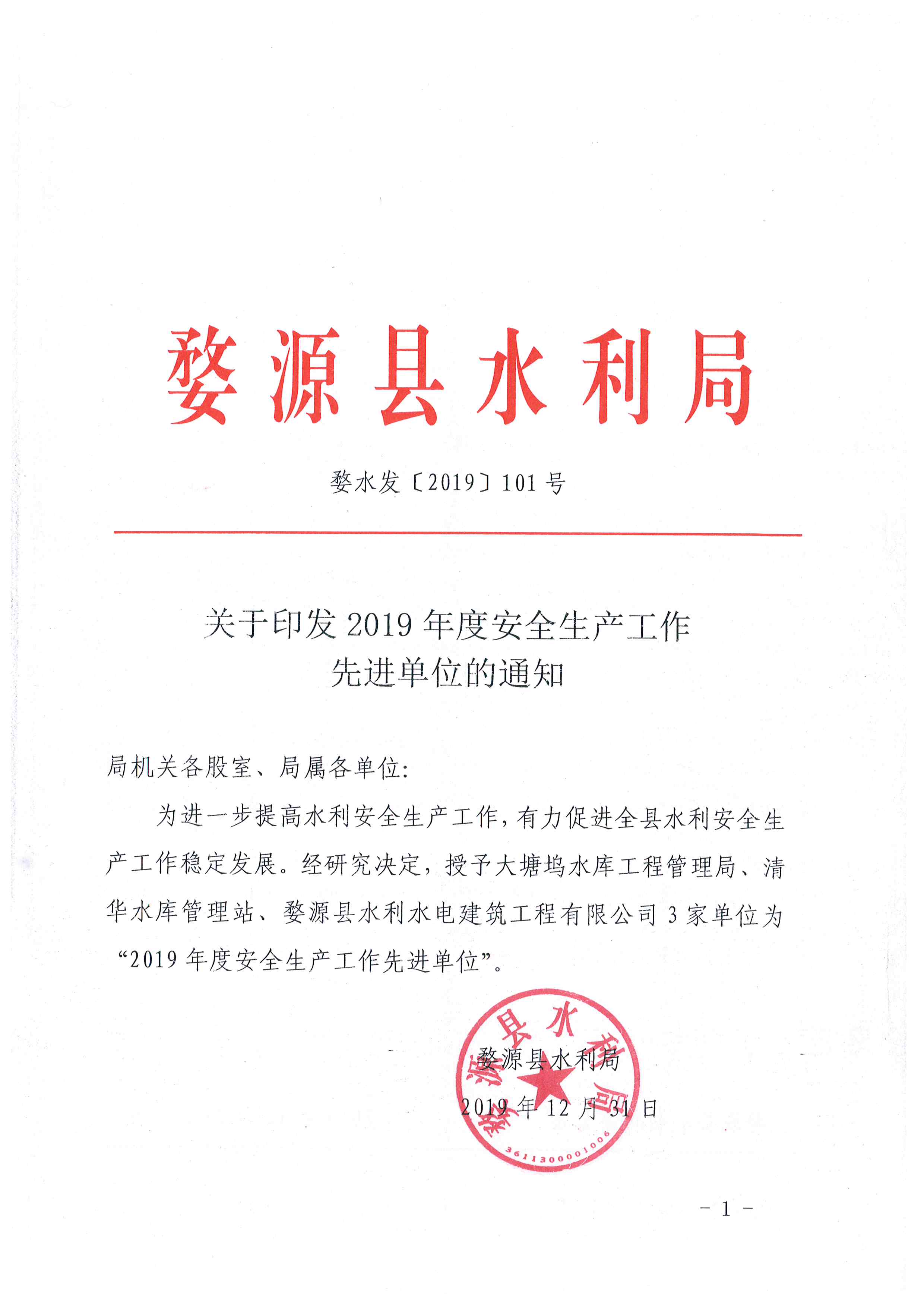 關(guān)于印發(fā)2019年度安全生產(chǎn)工作先進(jìn)單位的通知