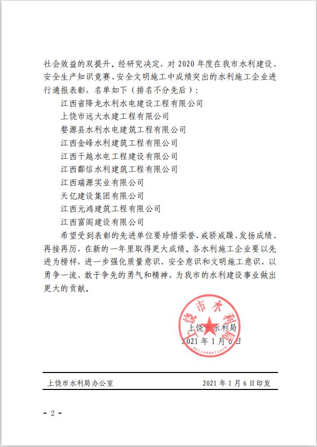 上饒市水利局關(guān)于表彰2020年度上饒市水利施工企業(yè)安全生產(chǎn)先進(jìn)單位的通報(bào)